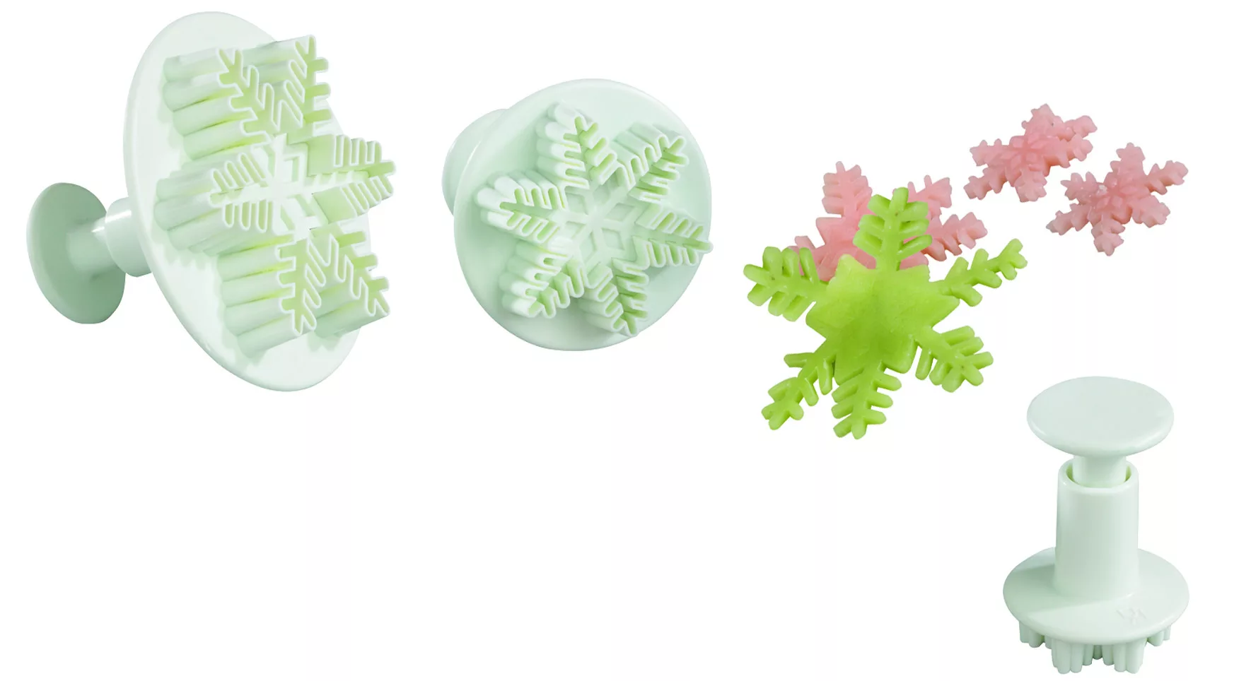 Ce découpoir plastique empreinte + poussoir étoiles de neige permet de découper et marquer la pâte en même temps, le poussoir éjecte la pâte découpée.